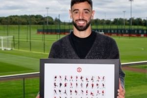 百球里程碑纪念!B费获曼联官方赠送的100球纪念框