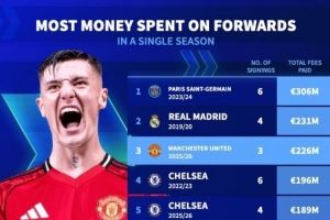 单一赛季锋线引援花费榜:曼联今夏花2.26亿欧第三,巴黎皇马前二